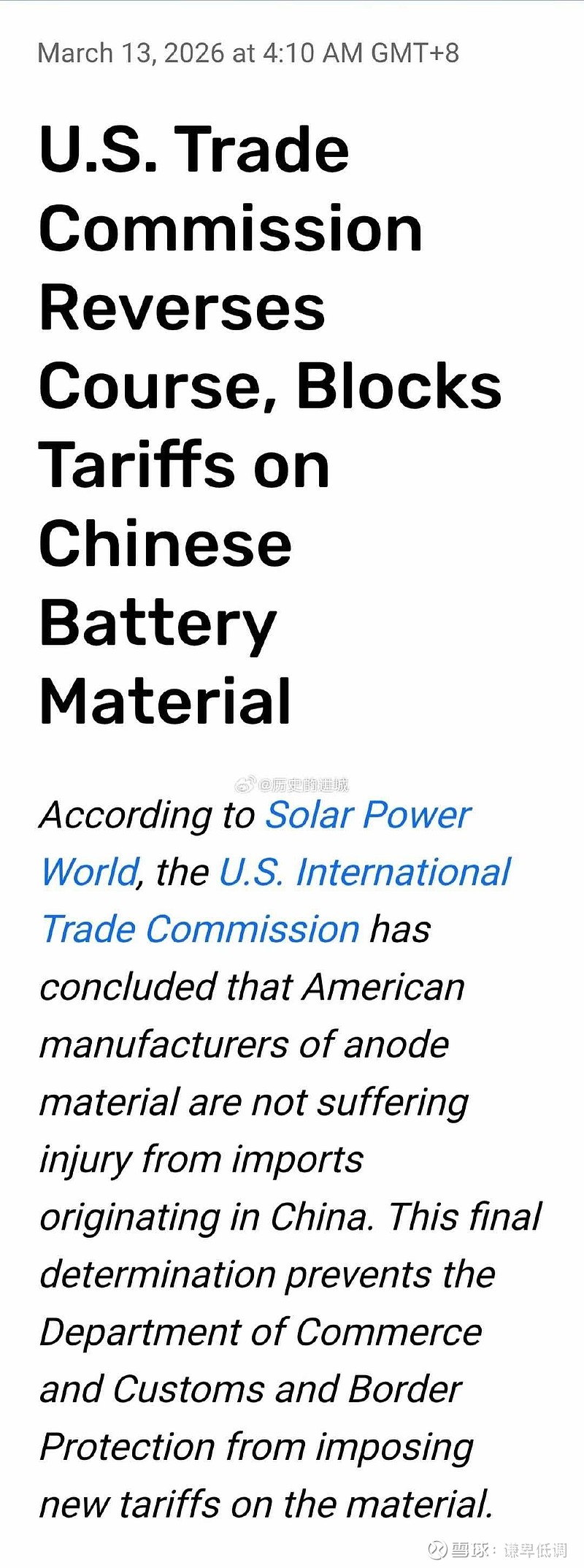 美国已决定不对从中国进口的电池负极材料征收关税。据《Solar Power World》报道,美国国际贸易委员会已认定,美国负极材料制造商并未因源自中国的进口产品而遭受损害。这一最终裁定阻止了美国商务部和海关边境保护局对该材料征收新的关税。$璞泰来(SH603659)$ $尚太科技(SZ001301)$ $亿纬锂能(SZ300014)$ 宁德时代,上证指数,创业板指,深证成指