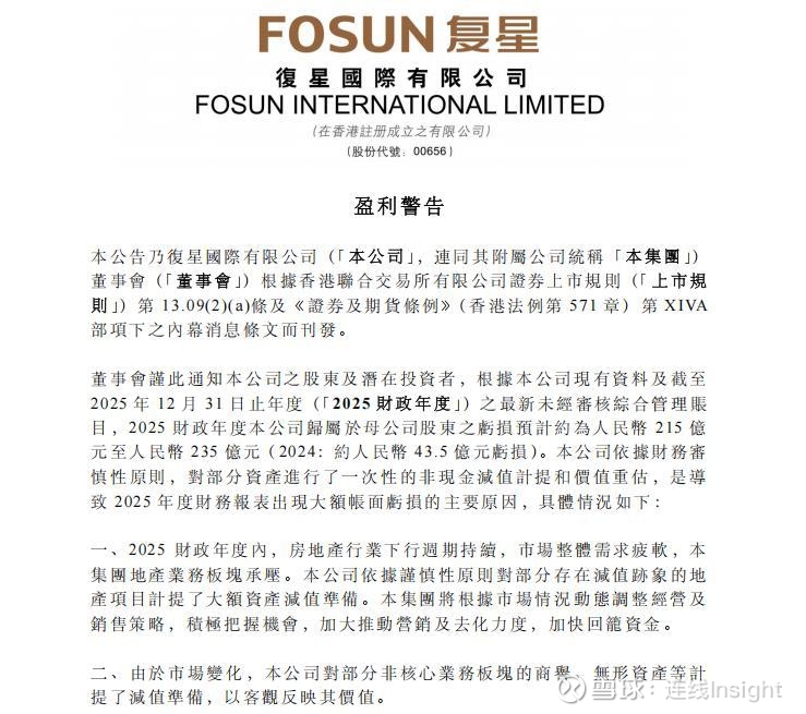 近日,复星国际发布2025财年盈利警告,预计报告期内亏损215亿元至235亿元。相较于2024年43.5亿元的亏损额,亏损幅度扩大近5倍。