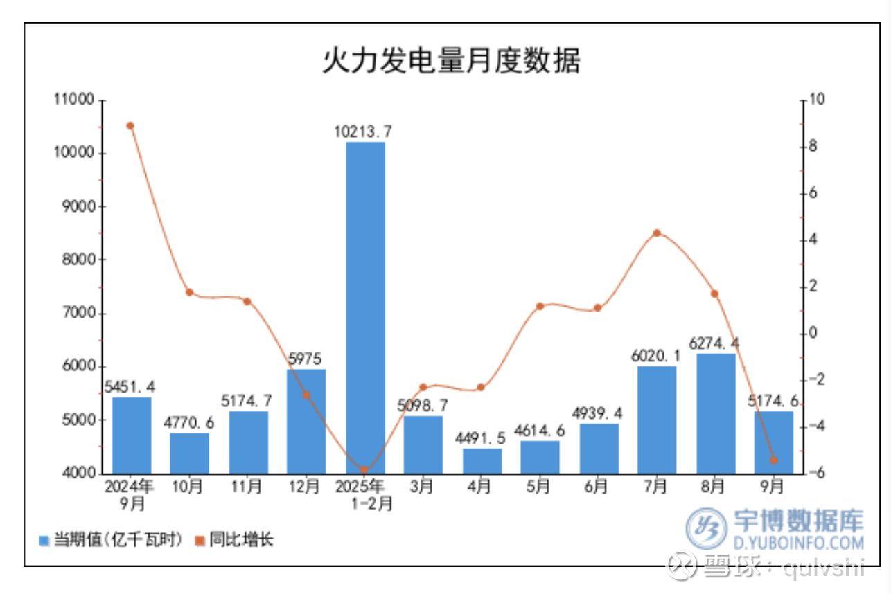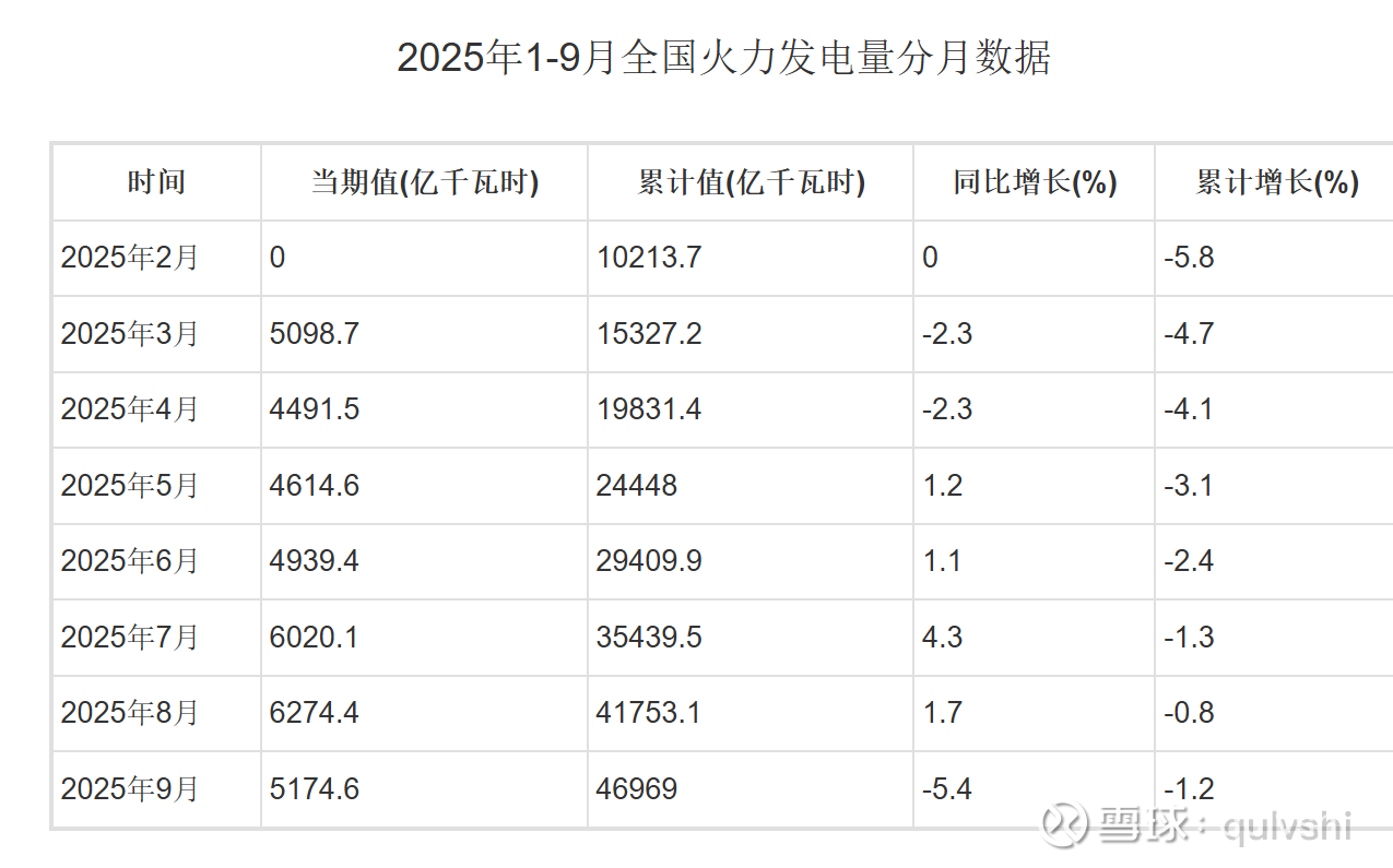 从上面统计可知,2025年5-9月,每个月的总发电量月均同比增长不到2%,哪怕最热的7月同比也仅仅3%,但是10月由于历史新高的高温天气,总发电量同比跳增到7.9%,9月火电发电量相比2024年9月还下降了5.4%,因为水电单月暴增了31.9%。