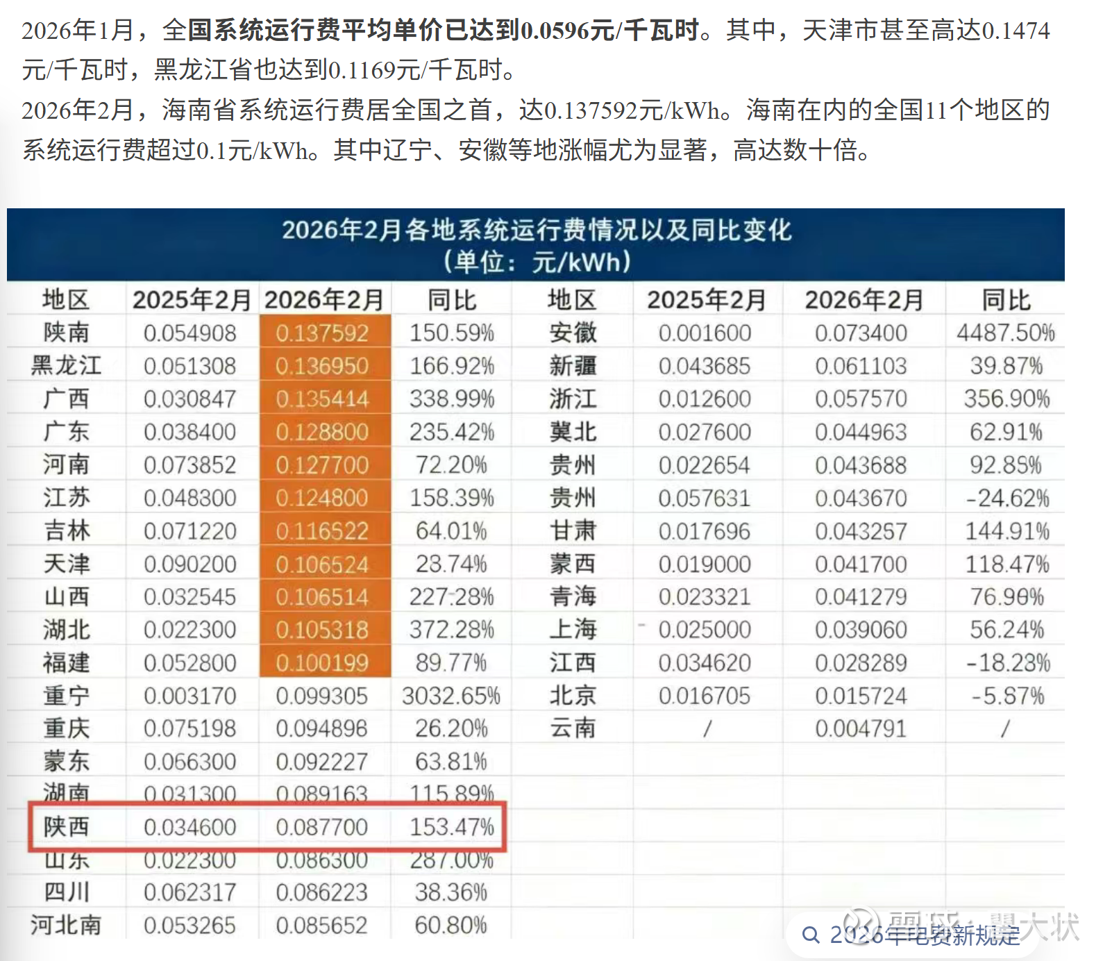 江苏省2026年2月系统运行费同比上涨158.39%(从0.0483元/kWh增至0.1248元/kWh),对华能国际业绩的影响需要具体分析。