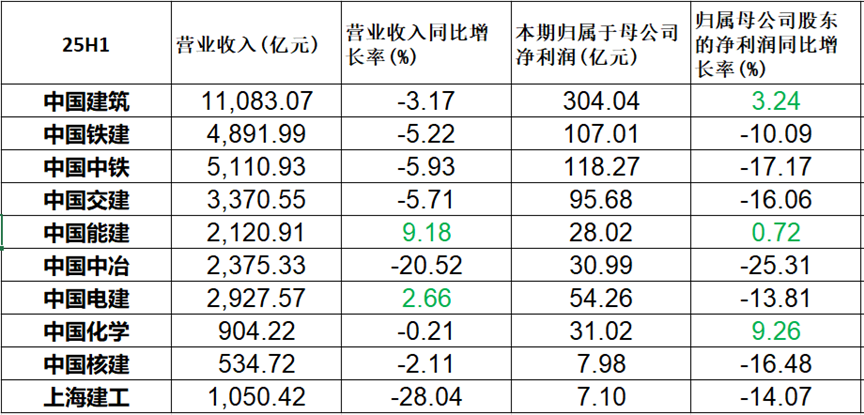 因为所有公司的半年报都发布了,我们再横向看一下各个建筑企业的半年经营情况。半年报营收同比增长的只有中国能建和中国电建,分别增长了9.18%和2.66%。而净利润同比增长的也只有中国建筑,中国能建和中国化学,分别增长了3.24¥,0.72%和9.26%。营收下跌最大的上海建工下跌了28.04%。龙头老大中国建筑也下跌了3.17%。中国建筑的营收占选出来的龙头企业的32.5%,比去年年底增加了3个百分点。净利润占比达到了38.8%,比去年年底增加了9.3个百分点。龙头集中的趋势非常明显。