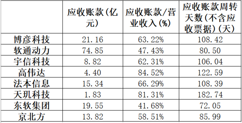 考虑到市场环境不好,再看看公司的应收账款情况。科技的应收账款这几年一直在增长,并且增长速度比营收增长速度快,最新一期的应收账款达到21.16亿元。占营业收入比例63.22%,应收账款(不含应收票据)的周转天数为108天。这个数据在可比公司中处于第4名,跟宇信和法本差不多,也还算正常吧。