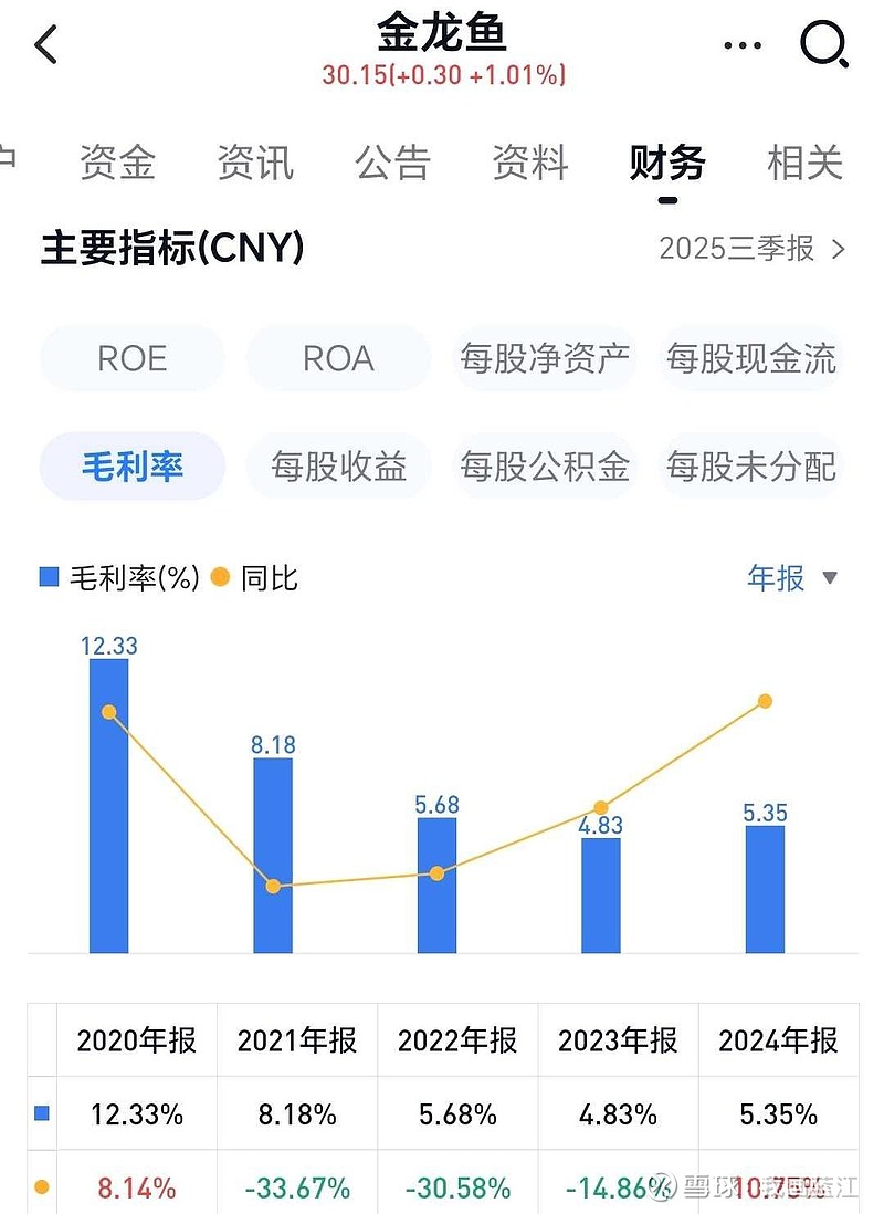 按照老林一直强调的财务指标来看,金龙鱼明显是不合格的,以老林最重视的毛利率变化指标来看,金龙鱼的毛利率连续几年都是下滑趋势,近期才稳住