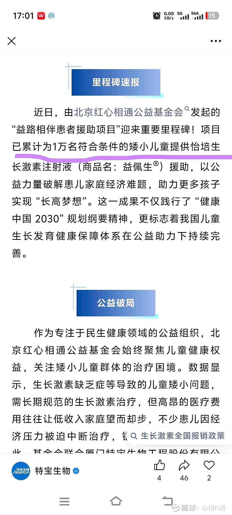 $特宝生物(SH688278)$ $长春高新(SZ000661)$ 近日,由北京红心相通公益基金会发起的“益路相伴患者援助项目”迎来重要里程碑!项目已累计为1万名符合条件的矮小儿童提供怡培生长激素注射液(商品名:益佩生®)援助,以公益力量破解患儿家庭经济难题,助力更多孩子实现 “长高梦想”。这一成果不仅践行了 “健康中国 2030” 规划纲要精神,更标志着我国儿童生长发育健康保障体系在公益助力下持续完善。