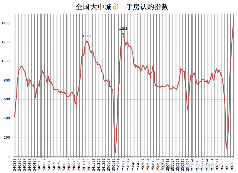 截至2026年3月15日,全国大中城市二手房认购创出历史新高,比2025年3月份高点高出10%以上,对齐春节数据后同比2025年节后第三周数据,同比上升20%。