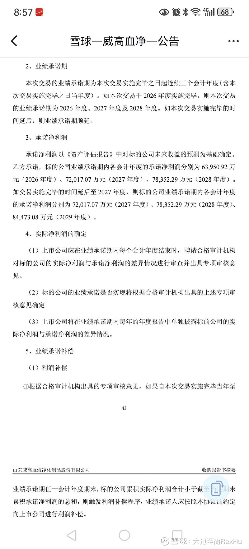 2026年威高普瑞承诺净利润63950万元,威高股份占94%股权,应占净利润6亿元。本次收购完成后,威高股份将合计持有威高血净51.35%的股份,假设威高血净2026年净利润保持5个亿,合并威高普瑞后,2026年净利润约11.4亿,动态市盈率约25PE,威高股份应占净利润约4.93亿,净利润比并购前减少1.07亿,2026年净利润约21亿,动态市盈率约10.3PE,对于威高血净,显著降低了估值,对于威高股份,13.3PE的价格贱卖威高普瑞,还减少了利润。$威高血净(SH603014)$ $威高骨科(SH688161)$