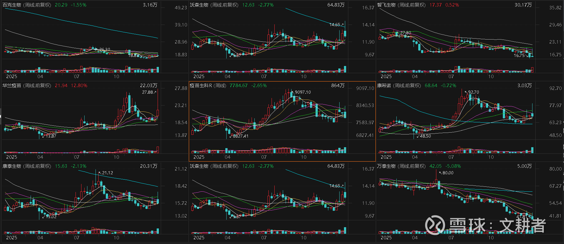 要注意的是行业的业绩报,之前已经连续将计提,以及各种利空释放了,这个时候业绩报能否改善是很关键的。从结果来看,$智飞生物(SZ300122)$ 、$万泰生物(SH603392)$ 等持续低迷,这个也是单一品种导致的结果;而$康希诺(SH688185)$ 、沃森生物、康泰生物等有改善,所以,板块也会产生分化,大家看年度走势,也能看出来分化的原因是业绩息息相关的。
