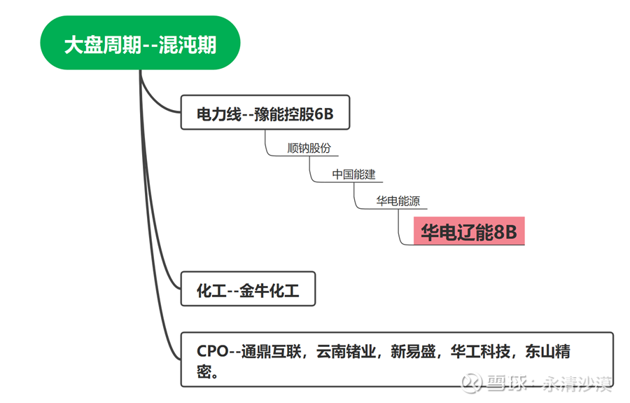 老师们你们还记得豫能控股出来的周期吗?实际上当时整个大盘周期应该处于混沌周期。虽然豫能控股上了6板,但是它并没有完全能够得到所有市场的共识。只是说当时豫能控股代表的电力线的周期,车流比较拥堵。