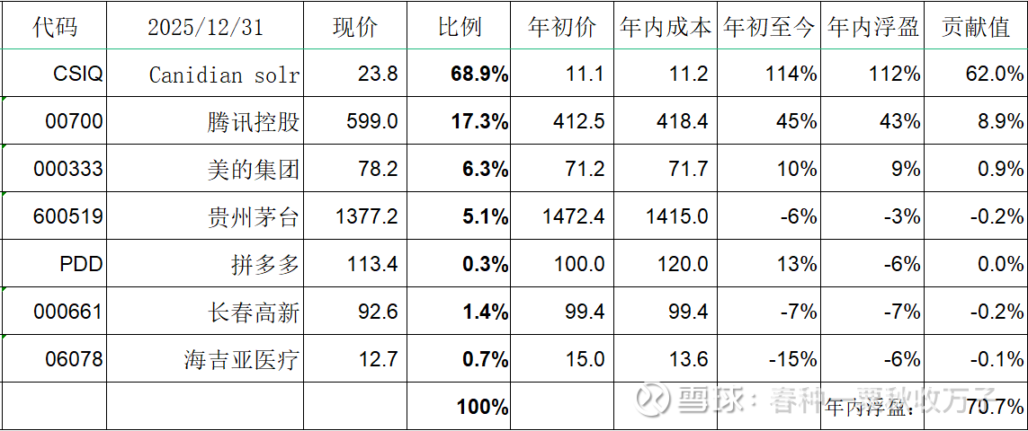 2025年投资组合中最大的功臣当属美股的Canidian solar(CSIQ),全年录得112%的超级收益,对全年投资收益率贡献值为62%,CSIQ在整个投资组合的权重比例上升至68.9%。