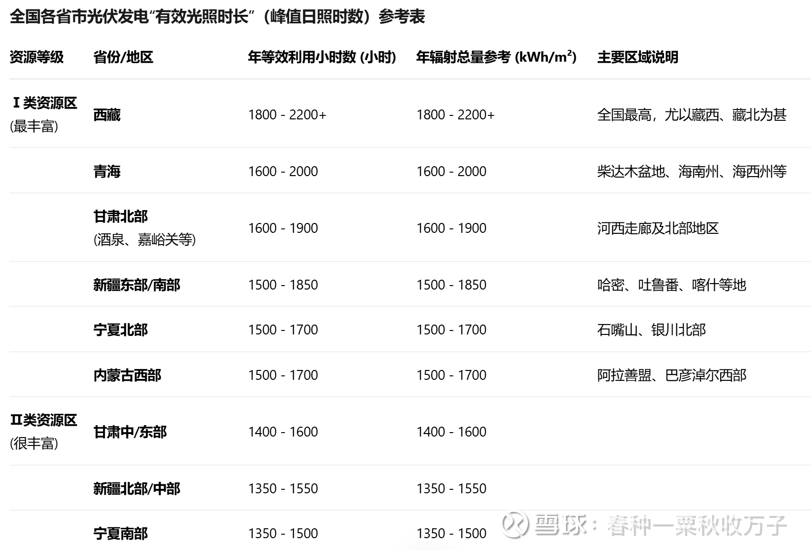 而光伏的发电时长取决于每天太阳光的照射时间,并非是24小时。甚至中午光照强,上午下午光照弱,甚至夏天和冬天光照强度也不一样,几乎没法对这个发电时长进行精确计算。实际操作中是采取等效利用小时数进行计算,不同地区等效利用小时数不同,公开数据网上能查得到,我截图大家参考下: