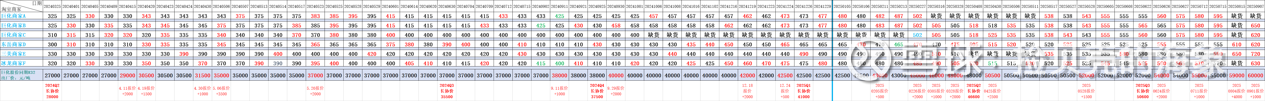 注:记录表中为淘宝销量较大几家商家R32 9.5KG规格商品的历史销售价格。红色字体表示最新提价,绿色字体表示最新降价。