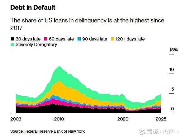 2025年第四季度,消费者拖欠率跃升至美国所有未偿家庭债务的 4.8%,创下自 2017 年以来的最高水平。其中,逾期至少 90 天的信用卡贷款比例达到 12.7%,为 2011 年以来的最高点;严重拖欠的汽车贷款攀升至 5.2%,逼近 2010 年的历史纪录;学生贷款拖欠率更是激增 16.3%,创下自 2004 年有记录以来的最大增幅。