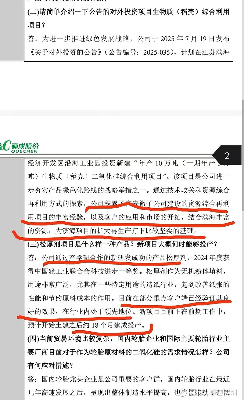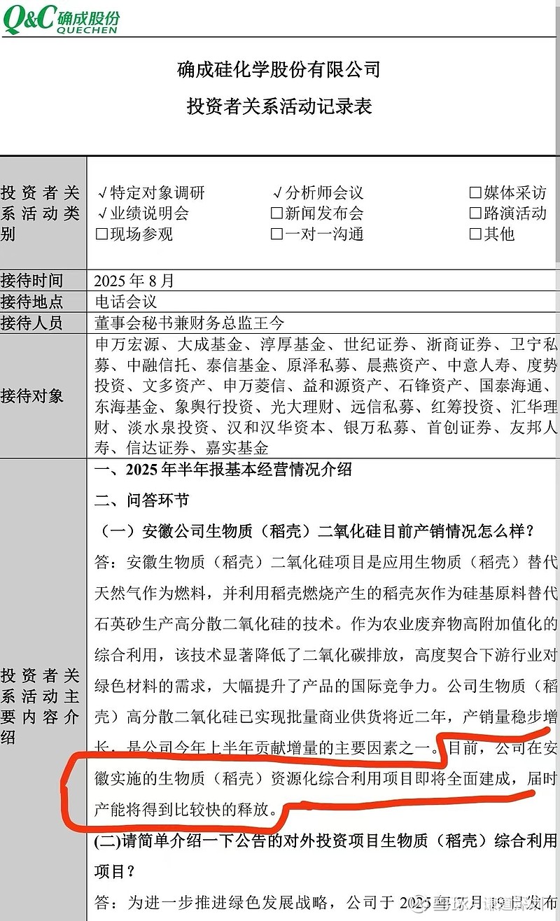 2025年9月1日,确成股份发布投资者关系活动记录公告,披露了8月份数十家公募、私募机构调研及业绩说明会的核心内容。本次公告聚焦公司核心业务进展、产能扩张规划及技术研发突破,展现出公司在生物质(稻壳)资源化领域的领先地位与长期增长潜力。结合行业趋势与政策环境,道哥的理解和大家一起分享探讨: