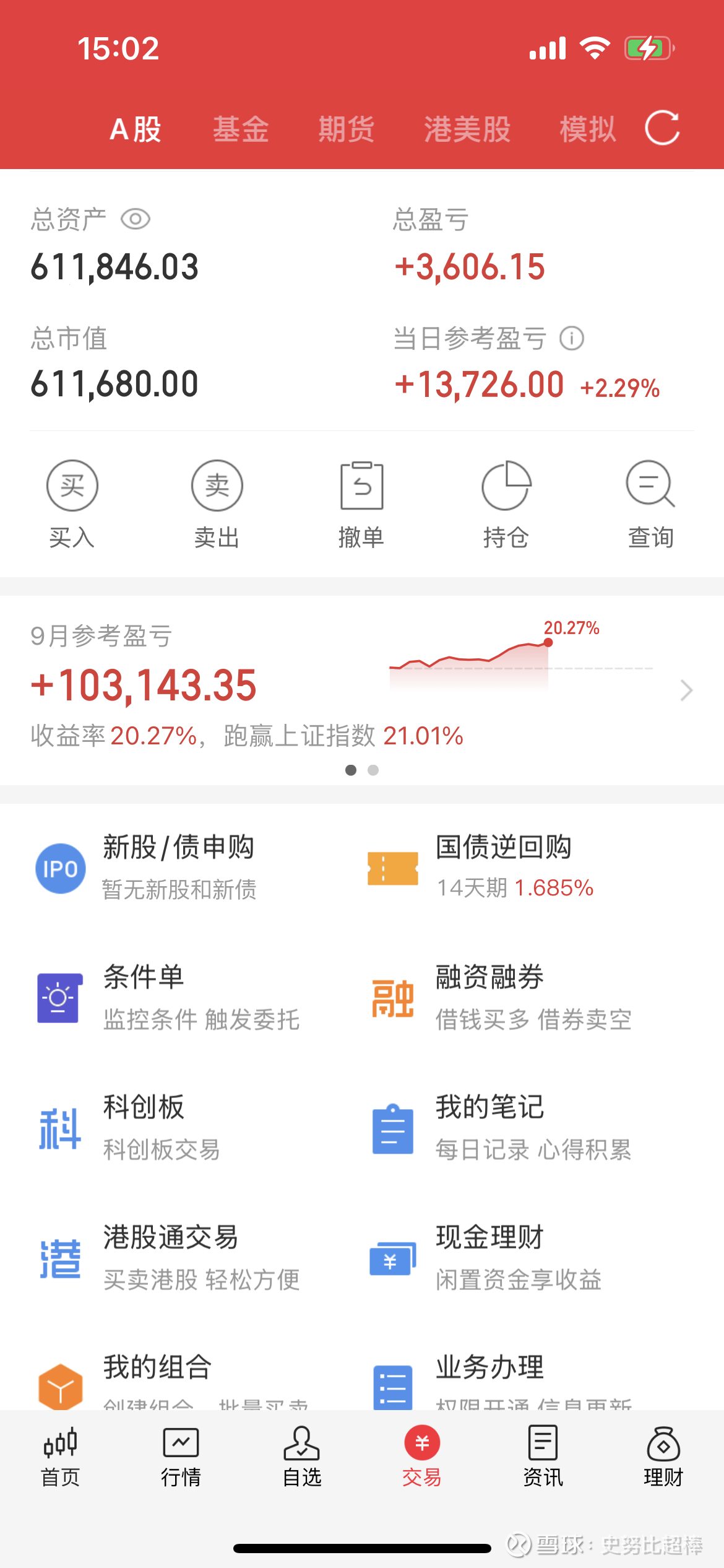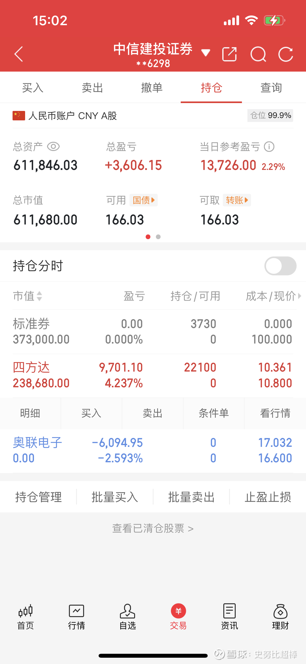 目前净值61万,以收盘的走势来看,就算指数没有借势调整,但节前的行情依旧是没啥确定性的,今天调仓买入的是四方达, 因为国债占用了仓位的缘故买的不多。但这样的配置,在心态上真的让自己感觉轻松了很多,节前的第一任务就是保住现用的利润,当然如果能锦上添花稍微的再多赚一点,那就更好了。。。$上证指数(SH000001)$ $四方达(SZ300179)$ $奥联电子(SZ300585)$