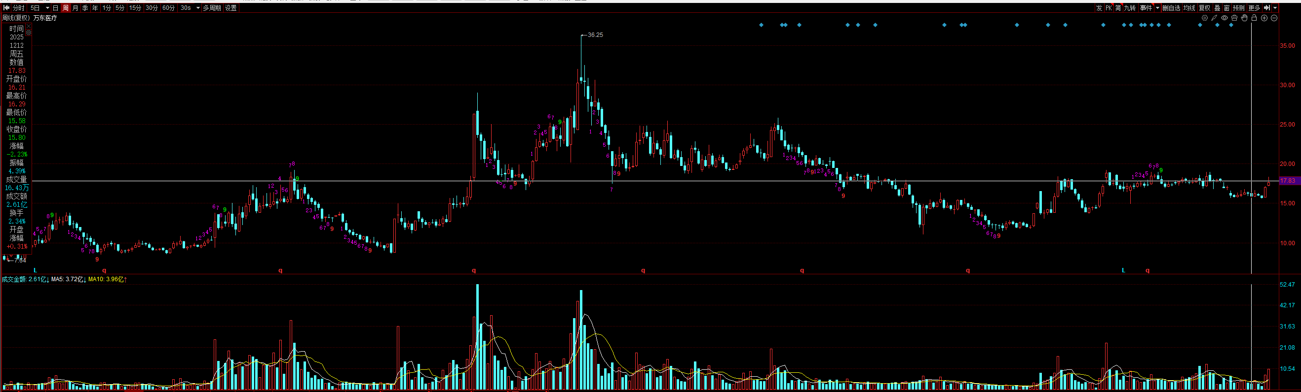 一图胜前言。K线会说话。观察医疗器械板块行业,很多医疗器械股票在2021-2024年是大跌的,而且底部波动很小,万东因为有美的入股的刺激,整体这几年呈现宽幅波动,924以来,股价其实上涨不算多,周K目前来到了这几个月的压力位置,我认为16块钱就是他的近期最低点了,因为医疗器械板块不太可能回到上个月的最低点,除非万东四季度爆大雷。很有可能哈,凭借医疗器械的贝塔行情,我认为值得一个贝塔行情的30CM。如果再加上AI影像的炒作赋能呢?如果再加上锐珂收购叙事的炒作赋能呢?且买且珍惜。