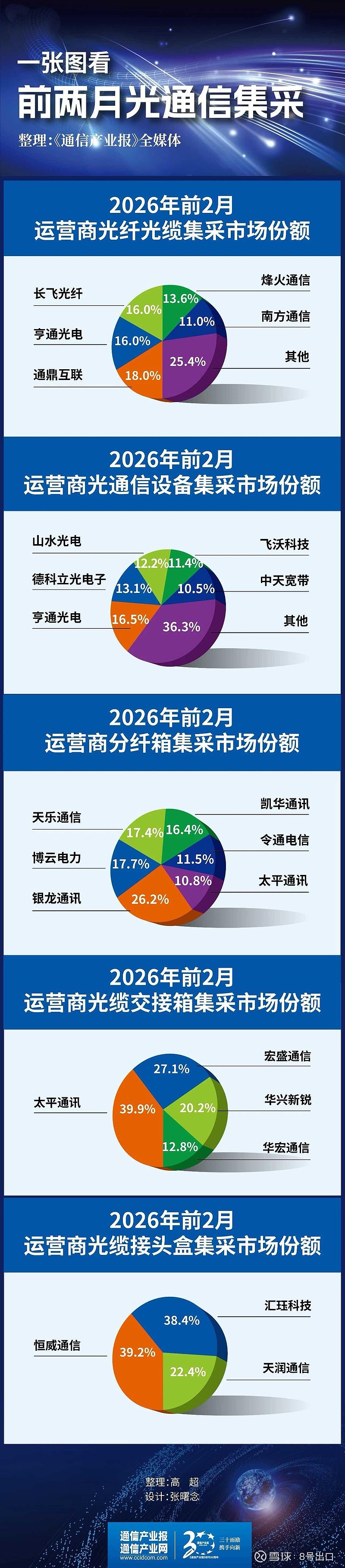 《通信产业报》全媒体梳理上述公开市场集采数据,统计分析了2026年前两个月内,运营商在光纤光缆、光通信设备、分纤箱、光缆交接箱、光缆接头盒五大产品领域的集采市场份额格局,制作了“一张图看懂前两月光通信集采”专题内容,以飨读者。$长飞光纤光缆(06869)$ $亨通光电(SH600487)$