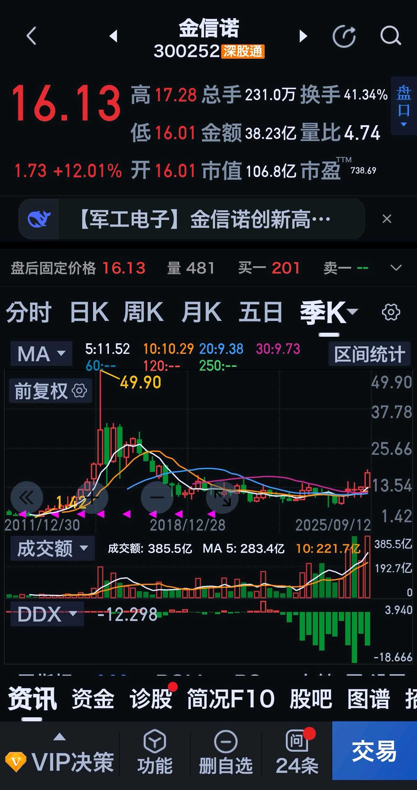 回复@啦啦啦5538: 为了我0.2%的资金还要去研究$金信诺(SZ300252)$ 的基本面?在搞笑吗?刚看了一下,原来是军工企业,和PCB、CPC有什么关系?看了下公司互动,公司业绩受PCB业务严重拖累,如果一直无法实现PCB业务扭亏为盈,建议公司尽快剥离打包出售,这样即可以立即让公司实现扭亏为盈又可以解决公司现金流严重不足的问题。关于近期日换手过大的问题,看了一下季线和年线的量能,底部天量,非盘即涨!我在试盘感,你还当真了?查看图片//@啦啦啦5538:回复@童言无忌666666:童大您好,想想您请教金信诺这个天量,是分歧过大吗,cpc板块有机会出一个类似长芯的角色吗