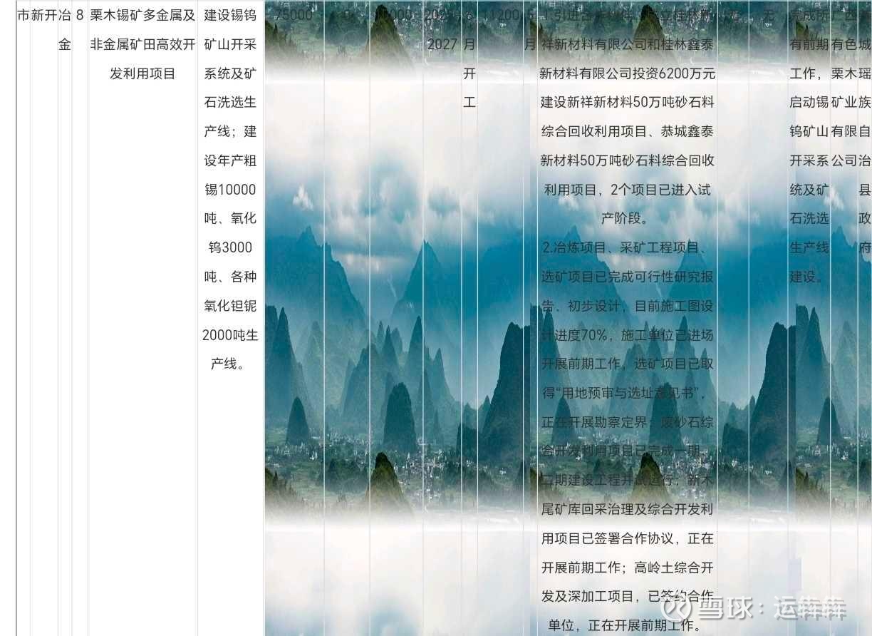 大家了解下广西有色栗木矿业现在这些新开建的矿石开采,洗选,冶炼年产一万吨粗锡,3000吨氧化钨,2000吨氧化钽氧化铌生产线,价值巨大且稀缺(粗锡二十多万一吨比标准锡锭便宜几万块,氧化钨四十万以上一吨,氧化钽一百五十万以上一吨,氧化铌三十五万以上一吨),并以此为契机,建立上游选矿,中游冶炼至下游精深加工的完整一体化生产体系。