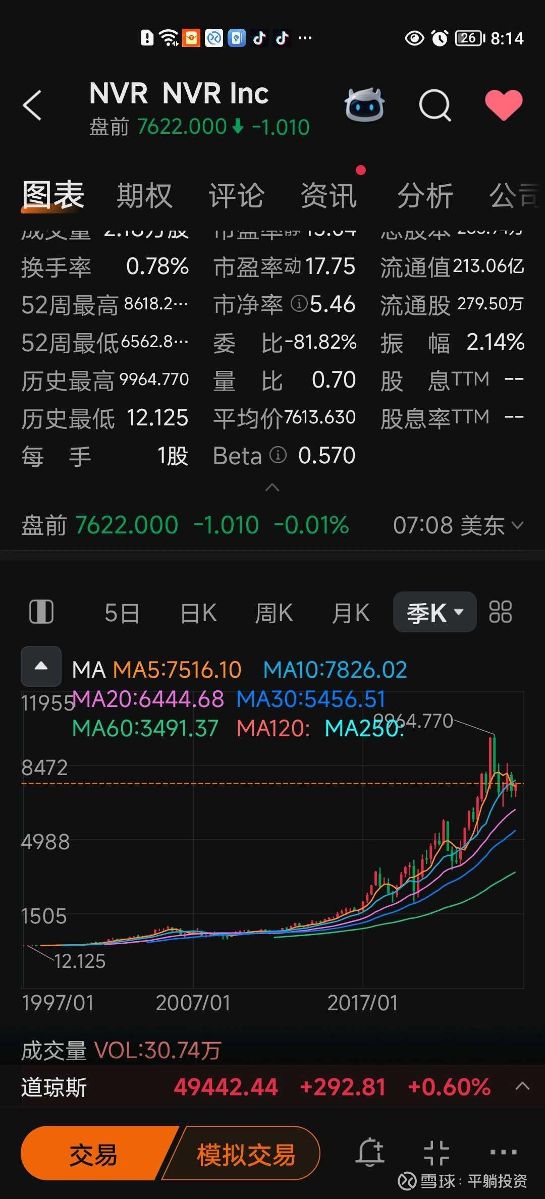 看看美国的房地产公司NVR,低峰期的时候0.2元,高峰期9000多元,现在7000多元。查看图片//@慢慢变富的践行者:回复@平躺投资:北部都市区啊,合22万/平米?