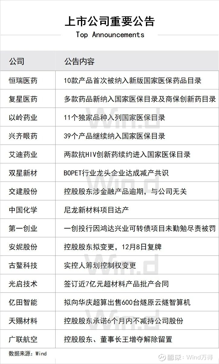1、国家医保局、人力资源社会保障部印发《国家基本医疗保险、生育保险和工伤保险药品目录》以及《商业健康保险创新药品目录》,自2026年1月1日起正式执行。这是国家医保局成立以来第8次调整医保药品目录。本次医保药品目录调整新增114种药品,其中50种为1类创新药。首版商保创新药目录共纳入19种药品,既有CAR-T等肿瘤治疗药品,也有社会关注度较高的阿尔茨海默病治疗药品。国家医疗保障局党组书记、局长章轲表示,将加快基于医保数据、医保立项和支付的场景,加快医保影像云建设,力争2027年以前基本实现医保影像的全国互通互认。