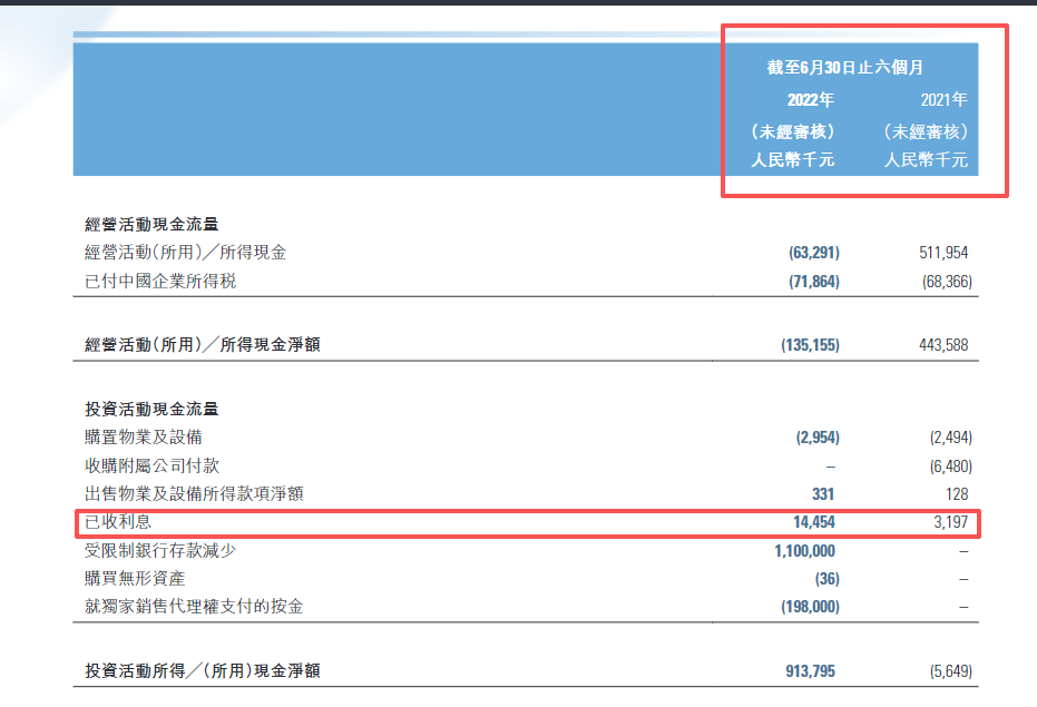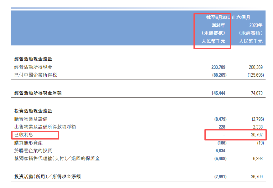 公司未经审核的半年报,现金流量表离得已收利息收入是- 零