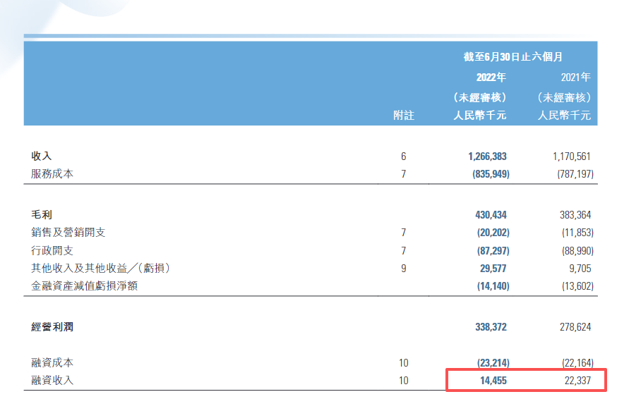 公司同期披露的这个融资收入和这个现金流量表里面2022年半年报几乎相等。而21年却相差极大