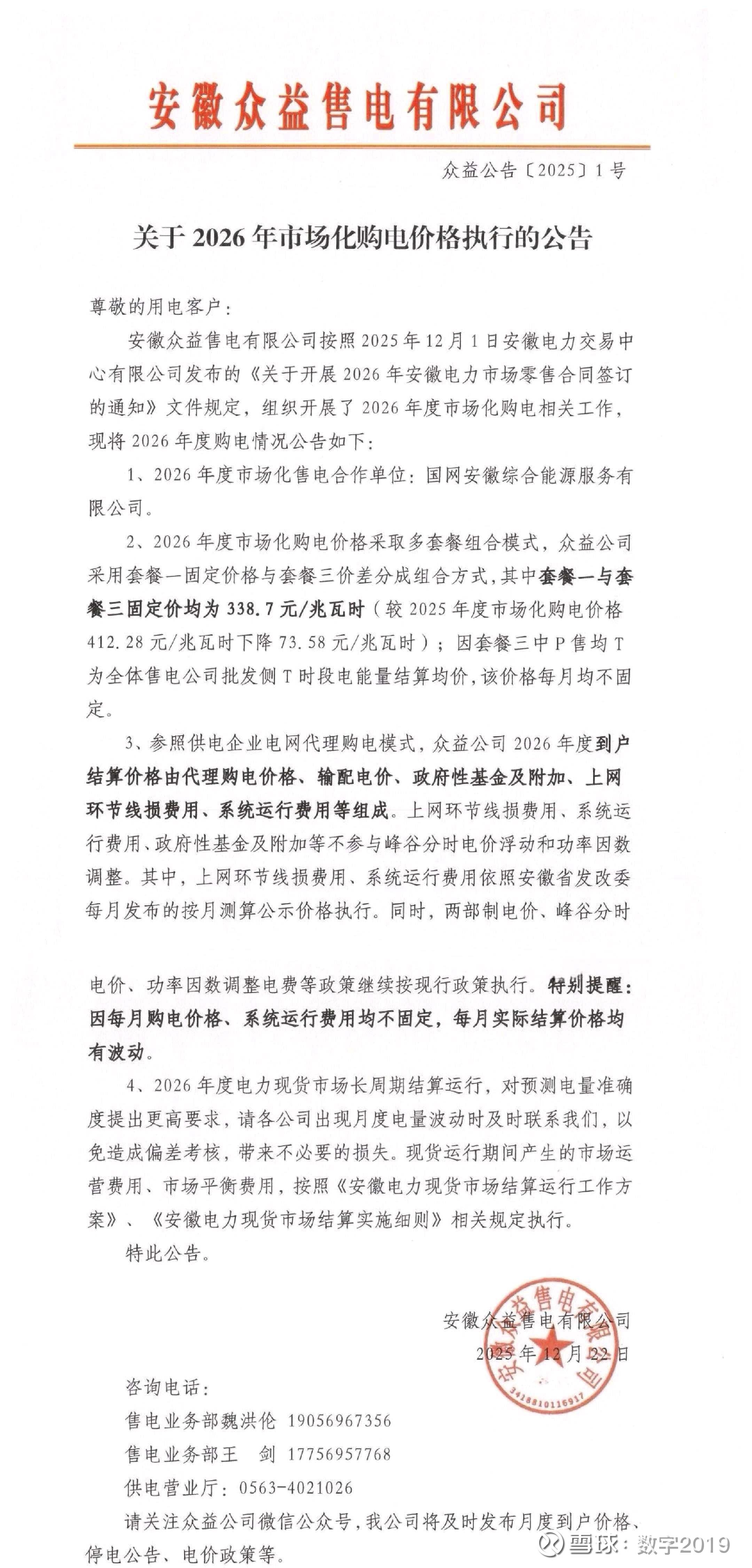 在回答上述问题之前,先看一则安徽当地售电公司的2026零售电价公告: