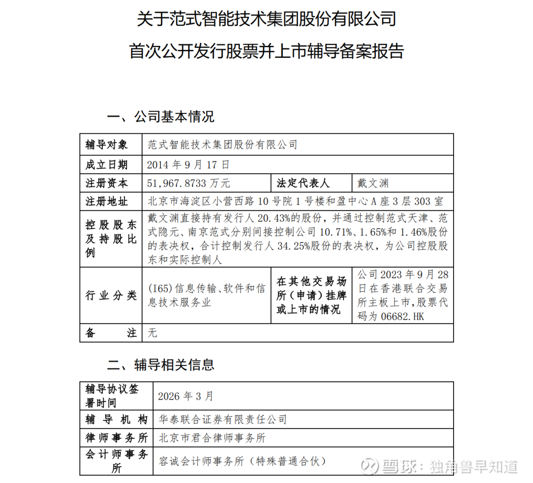 3月26日,证监会网站披露,范式智能技术集团股份有限公司在北京证监局办理辅导备案登记,拟首次公开发行股票并在深交所上市,辅导券商为华泰联合证券。