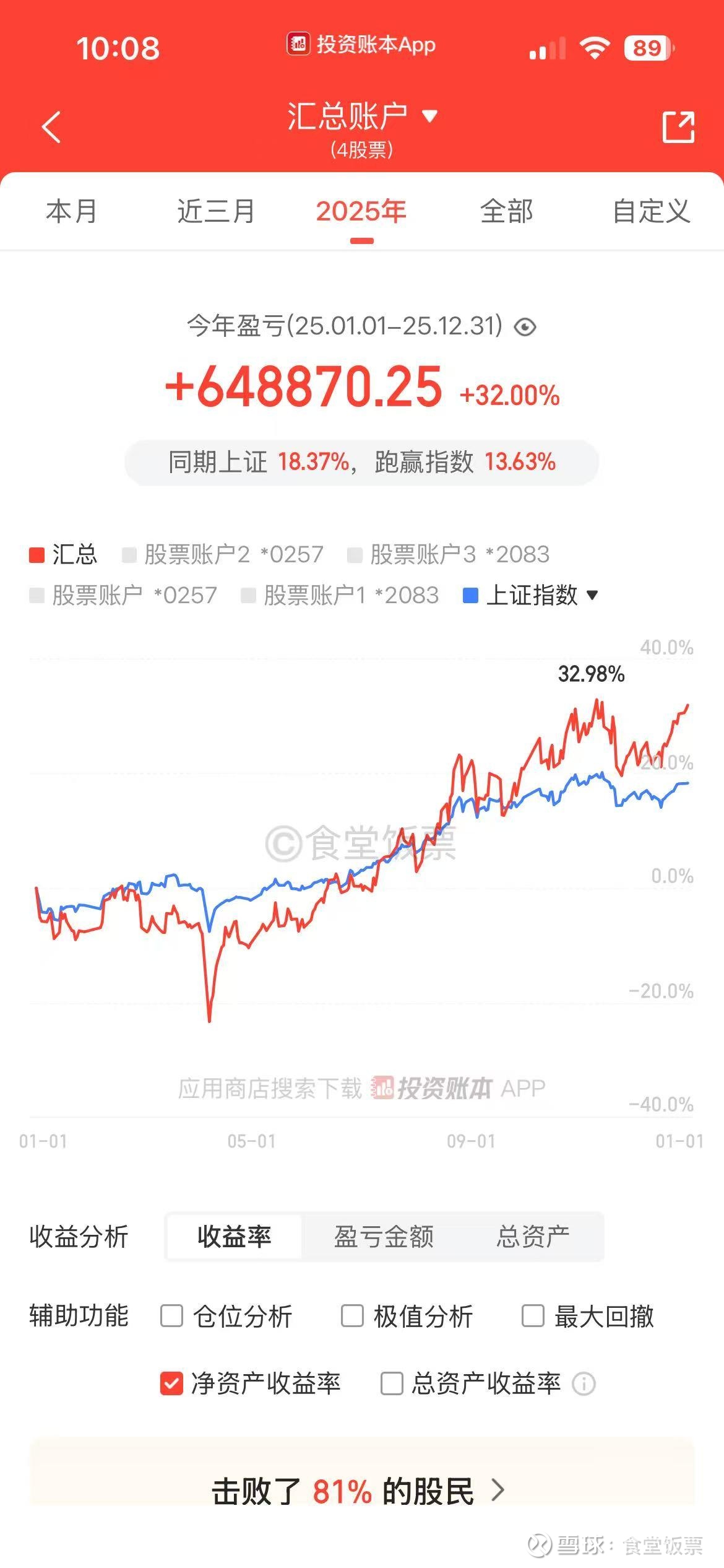 今年32%收益和23年25%、24年40%大致相当。但因为今年是牛市第一年,收益低于预期。一方面是因为我之前对牛市起点判断是2024年2月的2635而非2024年9月的2689,从而错判牛市浪型与节奏、以及券商节奏,因此今年融资加仓了券商没加科技和有色,但券商并没表现。二方面还是因为对科技理解不够,确定扩张周期复苏初期科技是主线之一、确定AI又是本轮周期主线,看好却不敢买。过去2年有三次(分别是2023.8月、2024.4月、2025.6月)在中际旭创与其他股二选一时都选了别的股,我印象三次中际旭创股价都是110-120块左右,水平菜没办法,都是缘分。