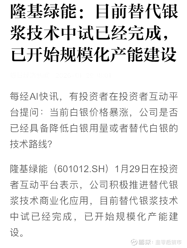技术破冰:隆基官宣铜电镀中试线验证成功并启动量产,标志着N型电池(HJT/TOPCon)金属化环节迎来成本拐点。银浆占电池非硅成本30%以上,而铜电镀可降本50%+并提升转换效率0.3%-0.5%,在白银价格波动加剧(COMEX库存骤降、交割危机频发)的当下,技术替代已从“可选项”变为“必选项”。