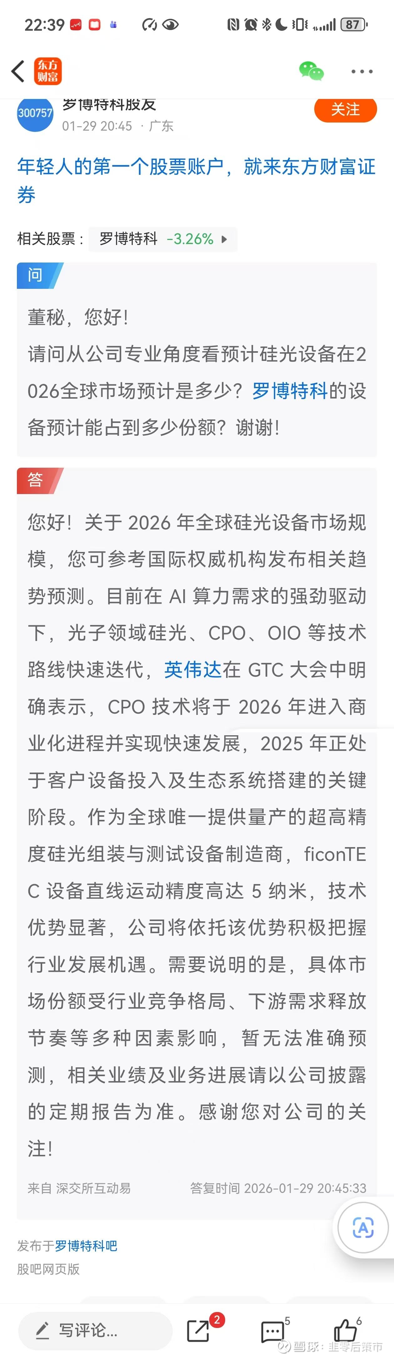 关于2026年全球硅光设备市场规模,您可参考国际权威机构发布相关趋势预测。目前在AI算力需求的强劲驱动下,光子领域硅光、CPO、OIO等技术路线快速迭代,英伟达在GTC大会中明确表示,CPO技术将于2026年进入商业化进程并实现快速发展,2025年正处于客户设备投入及生态系统搭建的关键阶段。作为全球唯一提供量产的超高精度硅光组装与测试设备制造商,ficonTEC设备直线运动精度高达5纳米,技术优势显著,公司将依托该优势积极把握行业发展机遇。