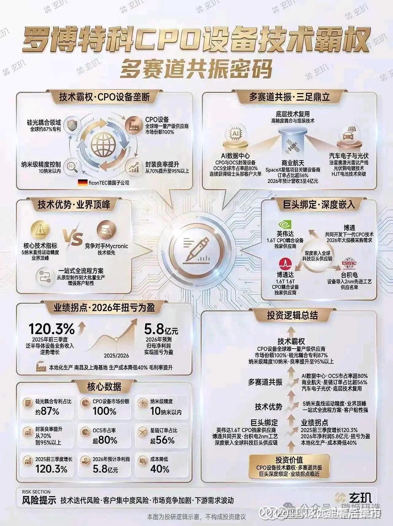 技术垄断:手握全球87%硅光耦合视觉专利,晶圆级光电同步测试技术为全球首发(与台积电、英伟达联合开发),微米/纳米级精度国内无竞品。SemiAnalysis报告证实其在英伟达GPU耦合领域份额接近垄断。