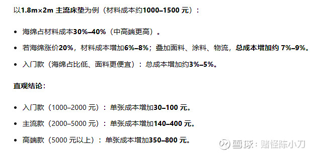 这个确实有一定影响,但根据测算,石油上涨仅会导致入门床垫成本增加3%-5%,中端成本增加约8%,高端增加约10%,但目前来看,市场对此显然过度定价了,因为石油很难长期维持此价格,且公司本身估值不高,已经跌了非常多,没有意义继续如此暴跌。