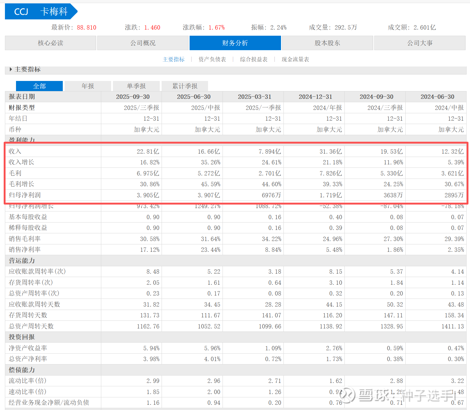 我收集了一些全球顶级铀生产商的数据,方便与中国铀业的增长和估值指标进行比较,具体公司名称如下,全球最大的优质铀矿公司是哈萨克斯坦铀矿公司Kazatomprom,但是关于该公司的财务数据比较少。排第二的是加拿大的卡梅科Cameco(美国上市),全球第二大铀矿开采商,产能占全球15%。其余的都是初级矿业公司,Boss Energy(澳大利亚上市公司)、中广核矿业(H股上市公司)。在这里我选了两家最有可比性的是卡梅科和中广核矿业。