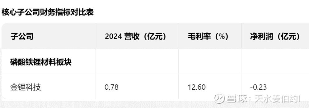 三、磷酸铁锂材料板块,这个板块就只有金锂科技一个公司,做磷酸铁锂正极材料的,集磷酸铁锂正极材料研发、生产、销售于一体,国内较早进入该领域的企业之一,产品覆盖动力电池、储能系统等场景,具备年产 1 万吨磷酸铁锂生产能力。2024 年营收 0.78 亿元、净利润 - 4682 万元;净资产约 3.5 亿元,商誉 0.8 亿元(2025 年预计全额计提)。