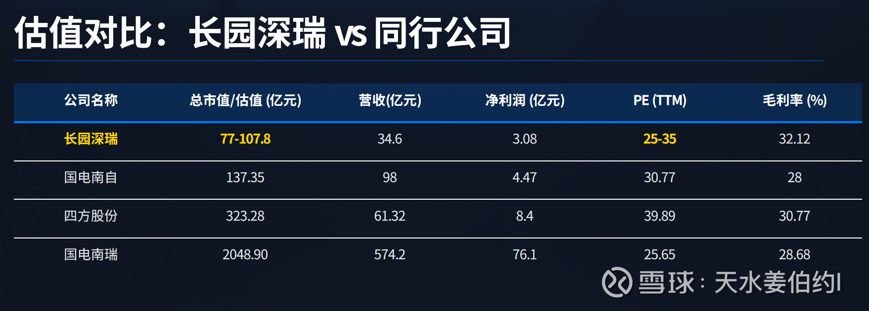 我买入长园的契机其实就是从上个月从长园深瑞采购二次设备开始,包括国电南自、北方四方、国电南瑞(旗下南瑞继保)我都有合作过,我认为长园深瑞的产品还是挺有竞争力的,上表黄色是我预估的PE,最近电力行业上涨了不少,PE都有点高,考虑到长园深瑞的毛利率是最高的,我保守给到25-35倍PE,对应估值77-107.8亿元。