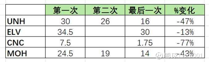 1) EPS调整变化,从下图我们可以得出MOH这次暴雷主要是又下调 eps guidance, 但我觉得同样情况发生在unh和cnc的可能性不高,因为这俩在上一次财报已经大幅下调,而moh这次的下调比例上其实还不如这俩之前的下调幅度。