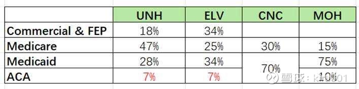 2) 看收入结构,我们从elv 和 moh财报得知主要因素是 Medicaid & aca, 尝试整理了这几家24年保险业务的收入分布,可能会有差异,因为各家的财报体现方式不一致,但大差不差。