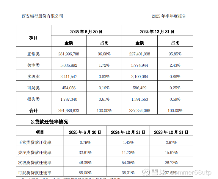 首先介绍,关注类贷款是非常主观的判断,五级贷款中只有后三级被计入不良贷款,关注类贷款常常是被用作不良的蓄水池,而西安银行在23和24年的关注类贷款的比例是异常高的,只是暂时还没有被划归到不良贷款之中。而在25半年报里,西安银行明显是由于营收的增长,有更多的底气,将一些曾经隐匿在关注类中的不良贷款转到了后三级中,计入了不良贷款。同时正常类的贷款占比也是显著在提升,我更倾向于西安银行整体的资产质量在好转,经过过去3年的低派息,相对处理了一部分之前遗留下的坑。