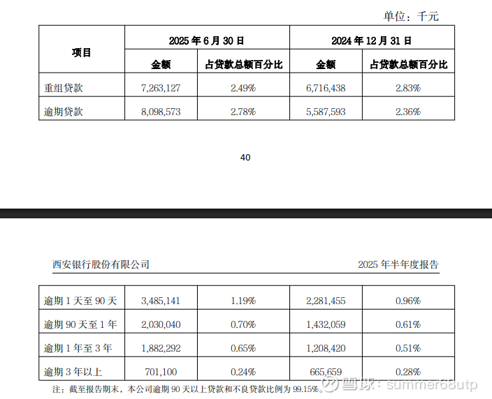 不过在中报中,西安银行的不良偏离率从24年末的81%上升到了99%,但仍处于100%以下,重组贷款和逾期贷款加起来的比例从5.19%上升到了5.27%。仍需关注,可能说明较多的新贷款出现了逾期的情况。