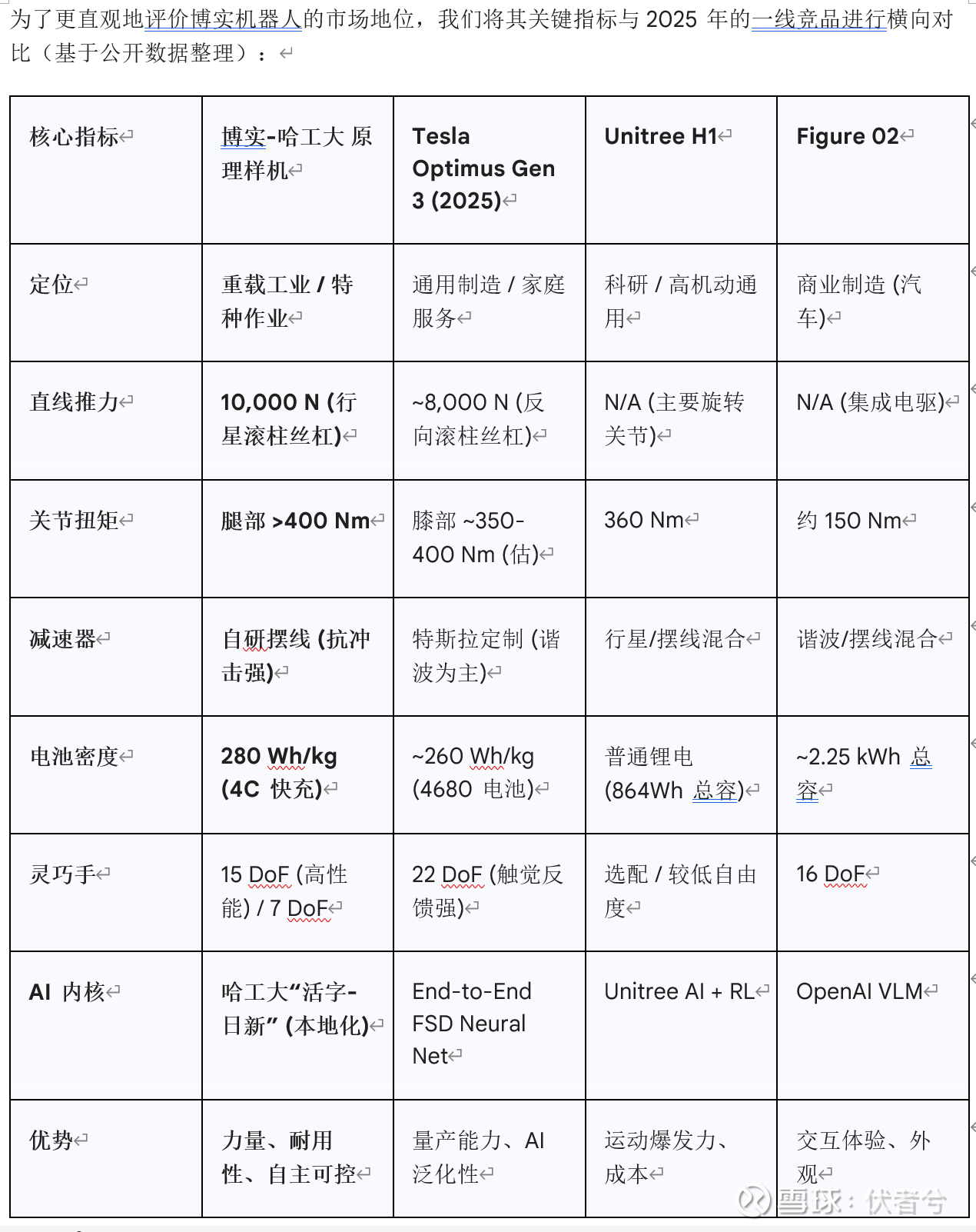 博实-哈工大机器人是中国“硬科技”路线的典型代表。它证明了中国企业在精密传动、高能电池和具身智能算法等核心环节具备了世界一流的整合能力。虽然在商业化进度和数据积累上暂时落后于西方头部玩家,但凭借其在重载工业领域的差异化定位和供应链的深度垂直整合,博实有望在2026-2027年开启的“人形机器人工业实战元年”中,占据高壁垒的垂直细分市场霸主地位。