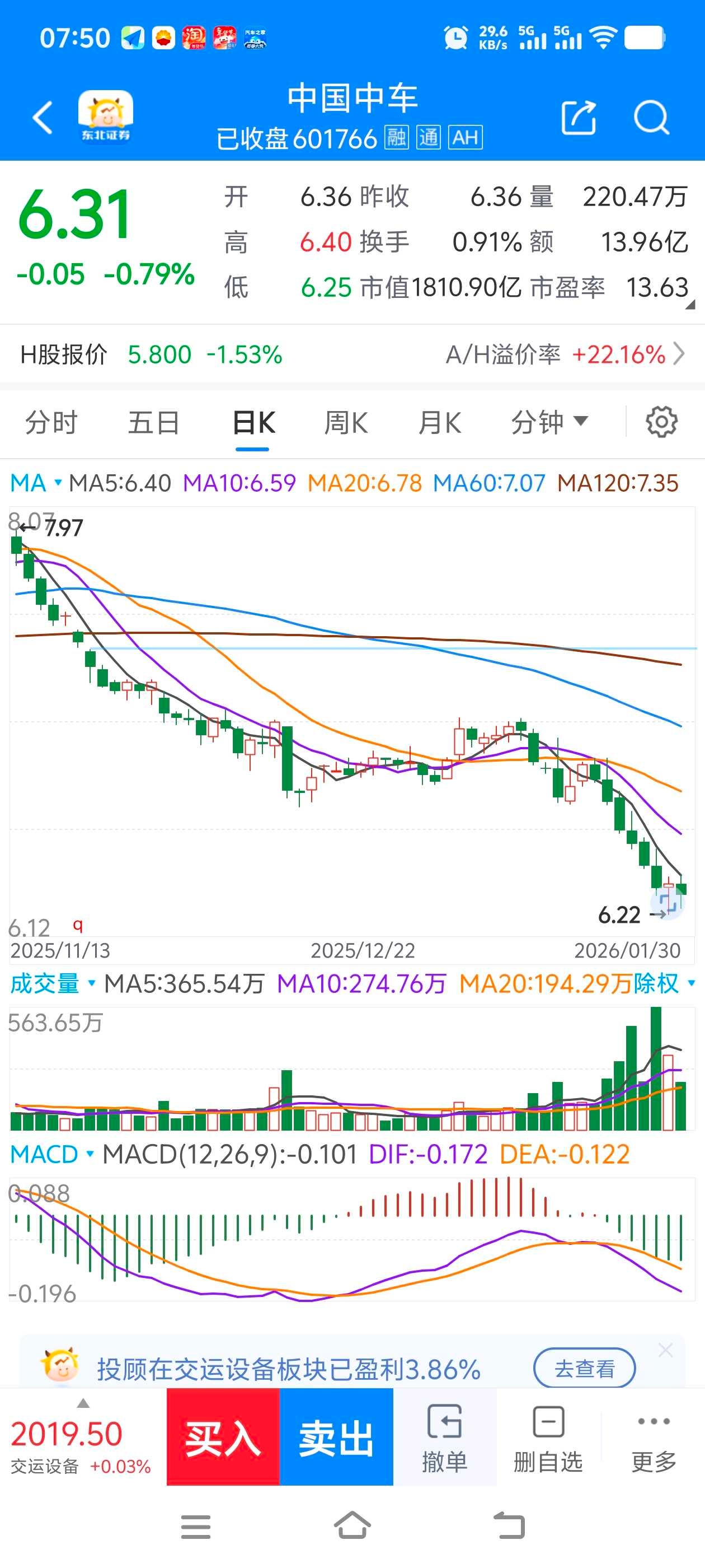 上周的中国中车,K线如铁轨般起伏蜿蜒,在红绿交替中铺展一段震荡沉浮的行情。1月26日,6.69元的盘中高点如信号塔般矗立,却成了本周仅有的高光,随后四日连阴的轨迹,将股价拖向6.22元的近一年低谷,最终以6.31元收官,4.39%的周跌幅刻下清冷印记。