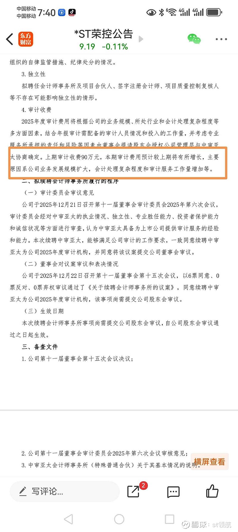 重点提示:1.续聘会计师事务所,2024年度该律所给公司年报和内控审计都是出具的标准无保留意见。2.本期审计费用预计较上期将有所增长,主要原因系公司业务发展规模扩大,会计处理复杂程度和审计服务工作量增加等。$*ST荣控(SZ000668)$