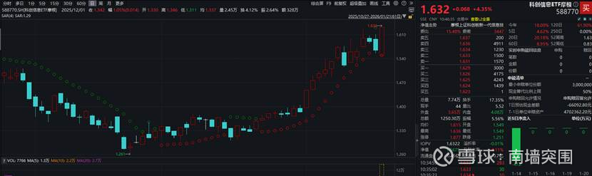 熟悉我的老粉都知道,我一直强调科技板块是未来两年的主线,尤其是AI、半导体、云计算这些新兴技术,现在已经慢慢成为A股的核心赛道,行情也是一路稳步升温。就拿今天的盘面来说,我长期跟踪的 $科创信息ETF摩根(SH588770)$ ,表现确实让人眼前一亮——早盘小幅高开后就一路强势冲高,截止目前涨幅已经超4%,日K线直接收出一根扎实的大阳线,实体部分很饱满,能明显看出多方力量在持续进场,盘中价格冲到1.636,创下近期新高。再看近期走势,日K线的中心一直在往上移,MACD红柱也在持续升高,很明显还处在持续上涨的区间,趋势非常稳。
