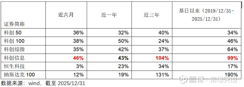 再看业绩表现,这支指数对比其他宽基指数,优势真的很明显。截止2025年底,近6个月上涨了46%,近3年上涨104%,从基日2019年12月31日到2025年12月31日,也上涨了99%,快翻倍了。可能有人不懂这些数据的意义,我简单说,短期来看,近6个月的表现,不管是美股科技、港股科技,还是科创板的其他指数,都被它碾压;中长期来看,3年、5年的业绩,也大幅跑赢港股科技和科创板其他指数,这样的业绩,不管是短期套利还是长期持有,都值得咱们锁定。