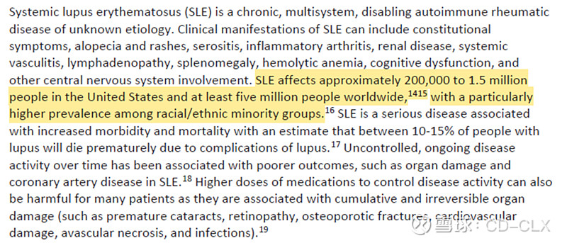 系统性红斑狼疮(systemic lupus erythematosus, SLE)是一种异质性自身免疫疾病,在不同患者之间临床表现、器官受累、疾病严重程度和实验室检查结果有很大差异。其特征是可以靶向许多器官和身体系统,包括皮肤、肾脏、关节、心血管系统和中枢神经系统。患者存在自身反应性 B 细胞和自身抗体水平升高,导致免疫系统障碍。据估计,全世界 SLE 患病率每10万人中有高达150例患者,每10万人年发病人数约为 1~10人。其中大约有 90%是女性患者,美国大约有20~150万人受影响。许多患者未完全控制疾病并且可以进展到终末期器官受累,SLE是一种与死亡率增加相关的一种严重疾病,大约有10~15%的SLE患者因为疾病并发症而过早死亡。