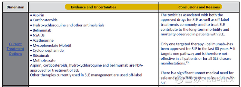 SLE标准治疗包括:皮质类固醇、非甾体抗炎药、抗疟药、和免疫抑制剂。在美国,现有少量的药物被批准用于治疗SLE,其中包括抗疟药、非甾体抗炎药、阿司匹林、皮质类固醇、硫唑嘌呤、霉酚酸酯、环磷酰胺、甲氨蝶呤, 贝利尤单抗(Belimumab),阿尼鲁单抗。国内获批还有荣昌生物的泰它西普。