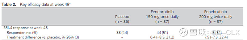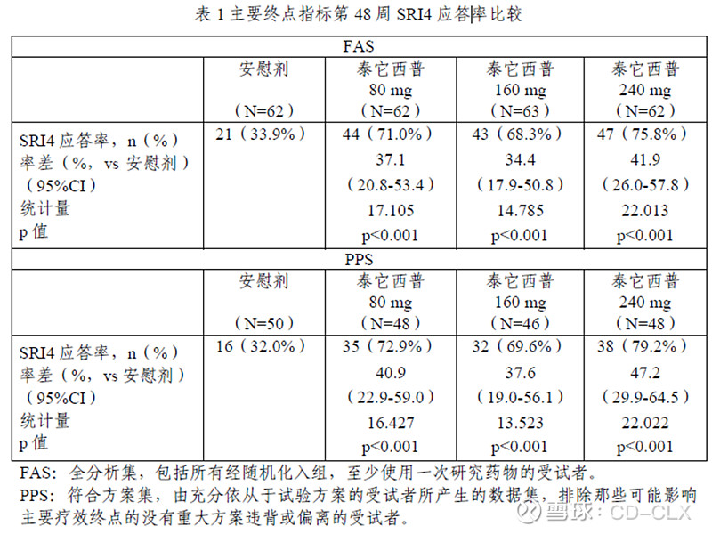 泰它西普国内获批的II期试验以及III确证性试验采用的主要疗效指标是SRI-4,以下是泰它西普II期试验的主要结果: