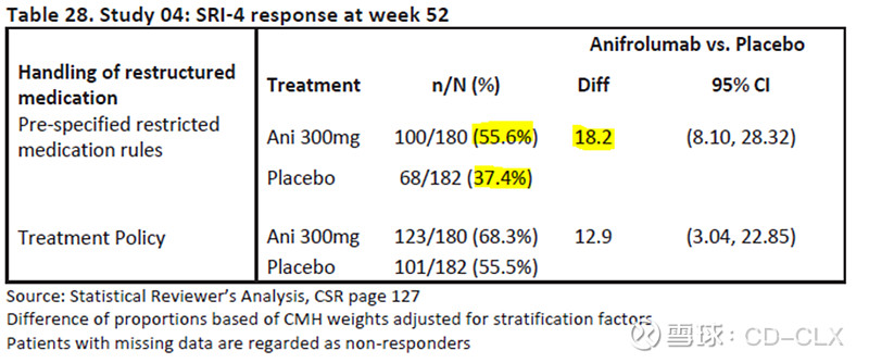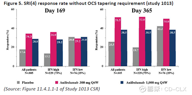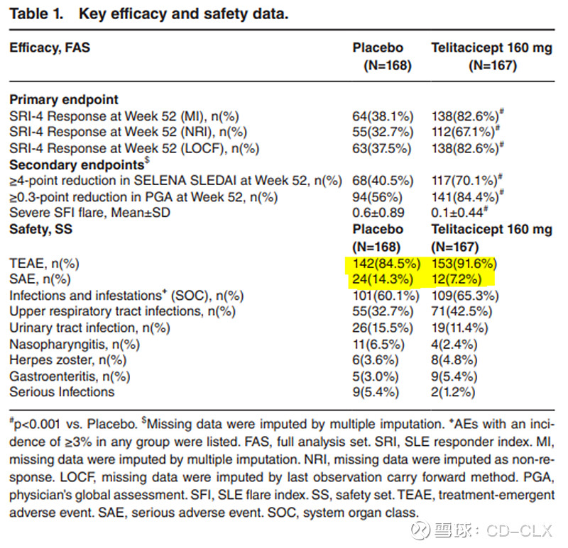 III期结果进一步验证了泰它西普在SLE的优异疗效,SRI-4 response在52周的时候达到了82.6%,远高于安慰剂组的38.1%,疗效提高超过40%。疗效远高于贝利尤单抗 (BENLYSTA),疗效仅仅比安慰剂好10%左右。即使是2021年获批的阿尼鲁单抗,疗效也是比安慰剂好一点点,其中一个III期试验还没能达到SRI-4主要终点,非常有意思的,通过与FDA沟通后,把另一个试验的主要终点换成了BICLA,好在这个试验比较给力,不管SRI-4和BICLA都达到了预设终点,最终FDA基于两个III期和一个II期综合数据认为有较好的获益风险比,给予批准上市。