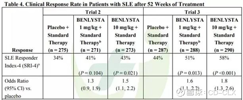 基于不列颠群岛狼疮评估组(BILAG)的复合性狼疮评估(BICLA) response: 与SRI-4 response前两条一样,不过排除掉那些BILAG未能识别的出现疾病恶化的患者。